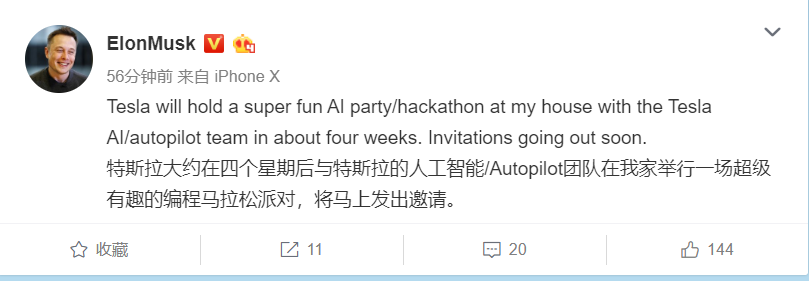 馬斯克:特斯拉AI/Autopilot團隊將在我家辦編程馬拉松派對 李楠 ? 2020年2月3日 10:57 ? 人工智能, 汽車 速途網訊 今日,特斯拉CEO馬斯克在微博表示,特斯拉AI/Autopilot團隊將舉辦編程馬拉松派對。馬斯克稱,大約在四個星期后,特斯拉人工智能/Autopilot團隊將在其家里舉行一場超級有趣的編程馬拉松派對,將馬上發出邀請。(李楠) 特斯拉馬斯克 贊 (0) 李楠 0 生成海報 李彥宏內部信:“做有溫度的公司,敢擔當的百度”比PV,比DAU重千鈞 上一篇 2020年2月3日 10:51 快手推出“宅家”專區,解鎖親情互動新姿勢 下一篇 2020年2月3日 11:16