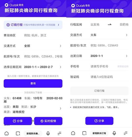 疫情爆發正值春節,大量往返人群乘坐飛機、高鐵、公交車等,放大了疫情擴散的風險,官方機構和權威媒體密集發出“緊急尋人”,提醒同行乘客進行必要的隔離和防治。 為此,夸克開發了“同行程查詢”功能,公眾可根據“地區”、“交通方式”、“車次”等等信息快捷查詢。