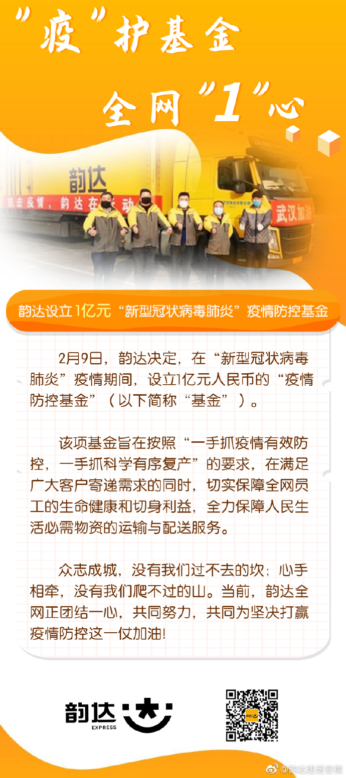 韻達設立1億元“新型冠狀病毒肺炎”疫情防控基金 仙雯 ? 2020年2月10日 10:47 ? 快訊, 貨運物流 速途網訊 昨日,韻達速遞宣布在“新型冠狀病毒肺炎”疫情期間設立1億元人民幣的“疫情防控基金”。該項基金旨在滿足客戶寄遞需求的同時,切實保障全網員工的生命健康和切身利益,保障人民生活必需物資的運輸與配送服務。 韻達速遞 贊 (0) 仙雯 0 生成海報 豌豆公主:聯合日本媒體速報醬向湖北捐贈4萬只口罩 上一篇 2020年2月10日 10:43 “GANOR佳諾教育”完成Pre-A輪融資 下一篇 2020年2月10日 10:58