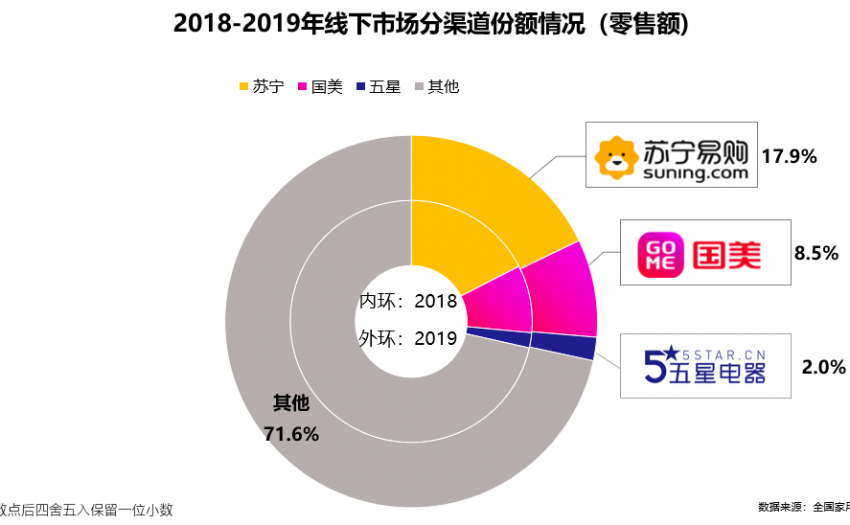 從具體布局來看,家電線下渠道結構相對穩定。蘇寧占比17.9%,較上一年增長0.4個百分點,占據家電線下市場的最大份額。其線下份額的增長離不開渠道下沉、企業并購等一系列措施,蘇寧小店的下沉也為家電銷售做出了貢獻。據悉,蘇寧小店的社區服務可以為蘇寧家電銷售提供精準的用戶使用情況、替換需求等新信息,從而針對性地展開促銷和產品推送。