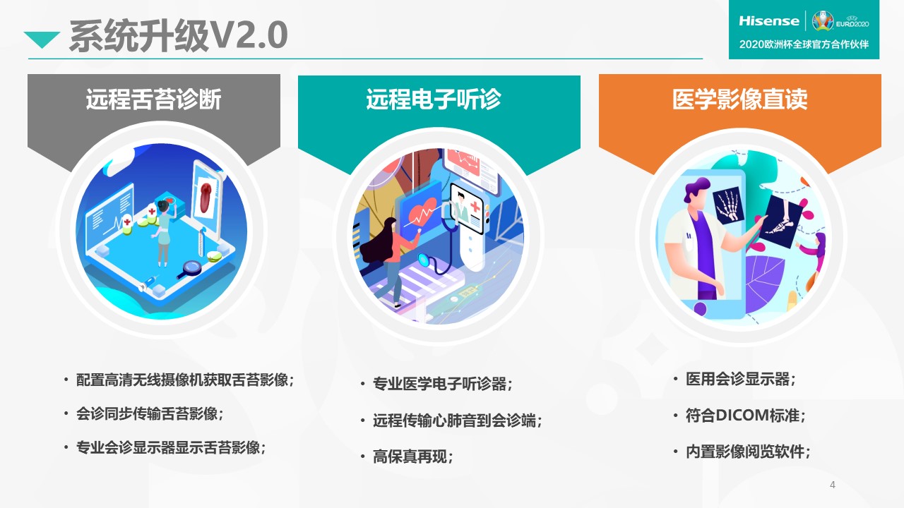 在定點救治醫院溝通后,海信醫療開發了感染病房遠程會診系統2.0版本,新增加了遠程電子聽診系統,可以高保真的還原患者的胸肺音。患者不需頻繁做有害的CT檢查,即可根據胸肺的電子聽診錄音,讓專家遠程判斷病情,確定診療方案是否有效。根據中西醫結合治療的需求,增加了舌苔數字影像,高清還原患者舌苔真實色彩和狀態,讓中醫專家診斷病情。而且這套系統還包含海信CAS瀏覽模塊,可瀏覽各種CT、DICOM影像,實現醫學影像的直讀。