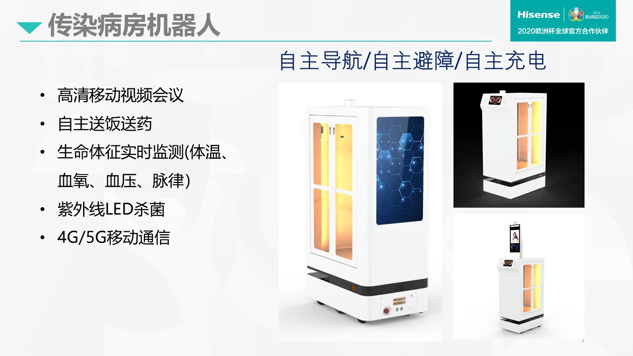 陳永健還表示,海信正在開發傳染病房多醫院遠程會診3.0版本,也就是運用機器人技術,比如移動視頻會議、送藥送飯、消毒、患者生命體征實時監測等,很多基本工作都是機器人操作,進一步減少了醫生與患者接觸的次數,緩解醫護人員人手不足的情況,也降低交叉感染的風險。