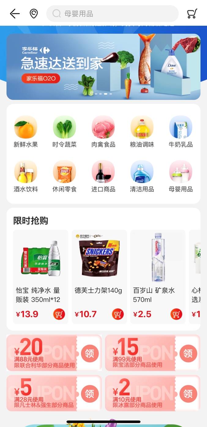 在商品方面,家樂福“同城配”服務覆蓋時令生鮮、糧油調味、酒水飲料、休閑零食、母嬰用品、個護清潔、家居百貨、各種進口商品等,全面保障消費者的物資供應。