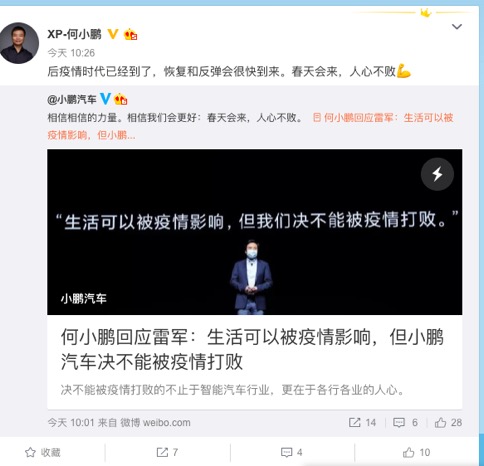 以下為何小鵬《生活可以被疫情影響,但我們決不能被疫情打敗》全文: