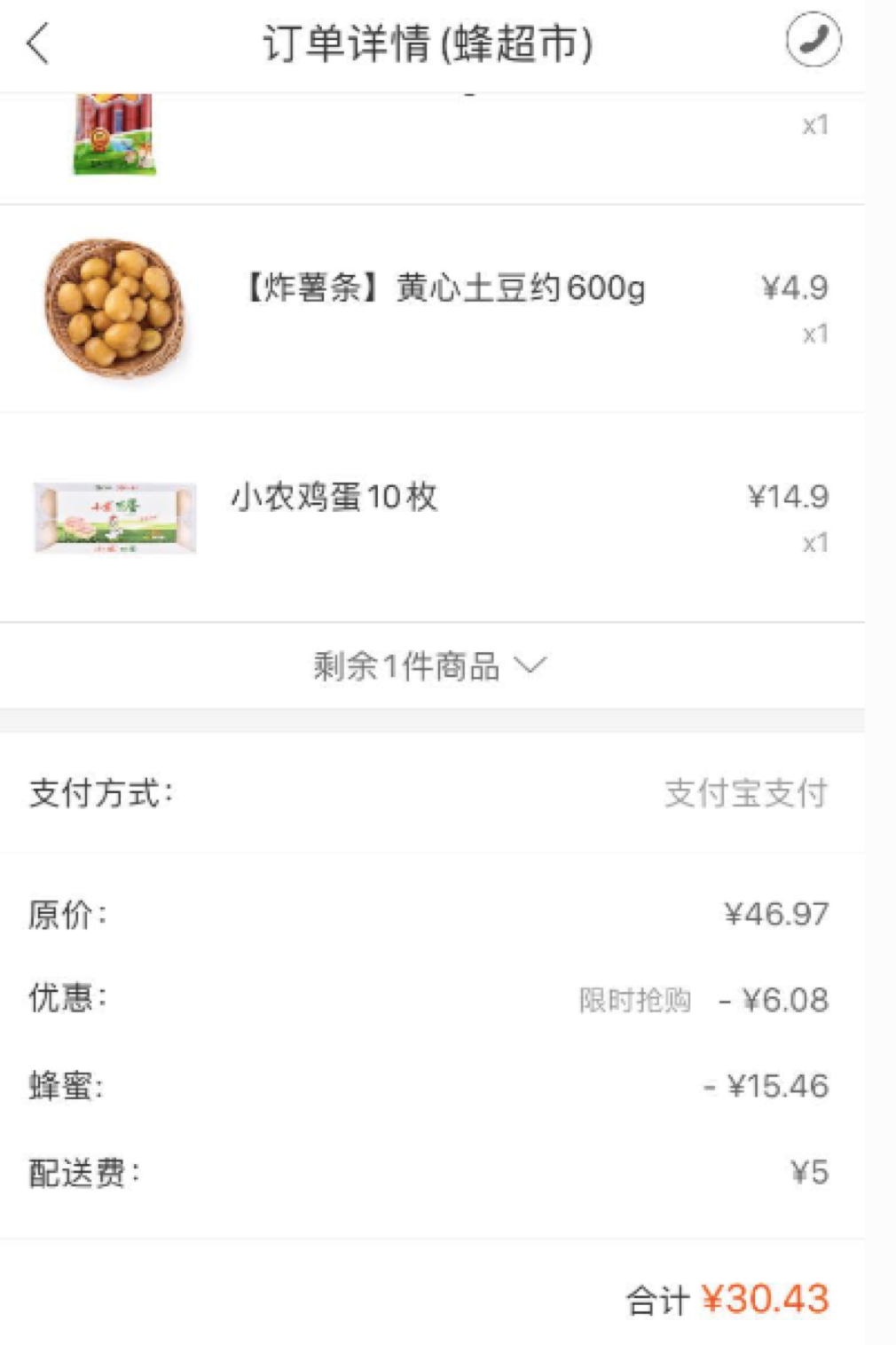 在夏夏曬出的訂單中,速途網(wǎng)觀察到蜂超市的蔬菜價(jià)格相比于超市等,波動(dòng)幅度較小。并且有蜂蜜抵扣、限時(shí)折扣等優(yōu)惠措施,從而占據(jù)一定的價(jià)格優(yōu)勢(shì)。