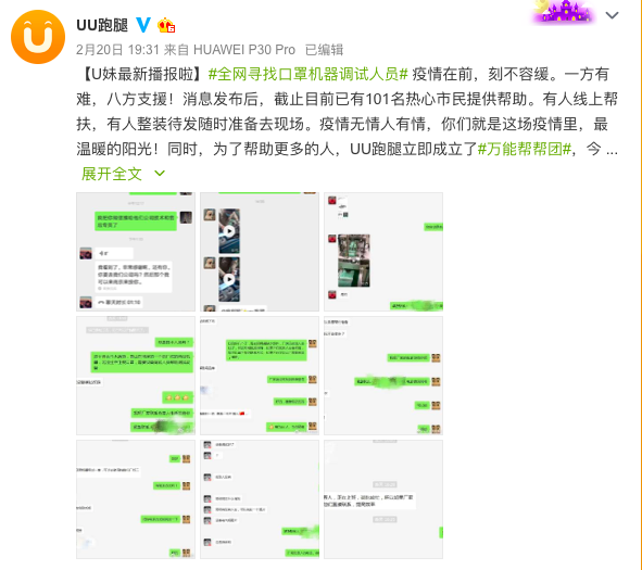 速途網2月21日消息(報道:吳佳馨)近日,UU跑腿發布緊急幫幫信息,全網尋找會調試口罩機器的師傅。
