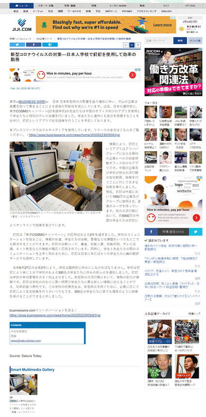 速途網訊 近日,據日本媒體JIJI.COM報道,在日本小長假來臨之前,日本語學校東京COSMO學園老師采用中國辦公軟件釘釘,與在校學生舉行了一場特別的視頻會議,提醒學生們在休假期間也要注意自我保護,并計劃通過釘釘開啟遠程上課。