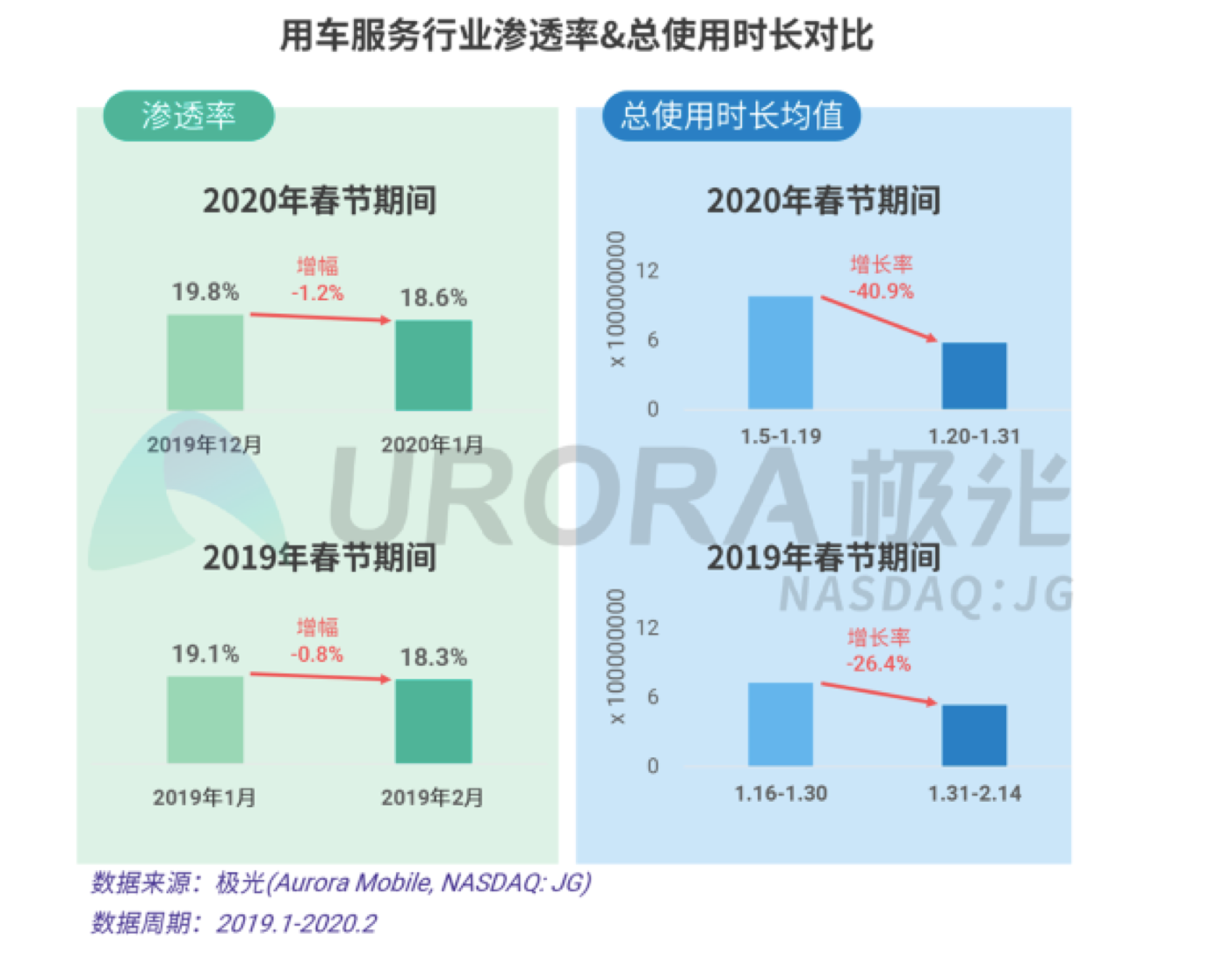 極光大數據近日發布的《2020年春節移動互聯網行業熱點觀察研究報告》顯示,受疫情影響,居民紛紛選擇居家隔離,并減少出行,以至于用車服務行業受到影響,行業總使用時長在1月份呈現顯著下降趨勢。
