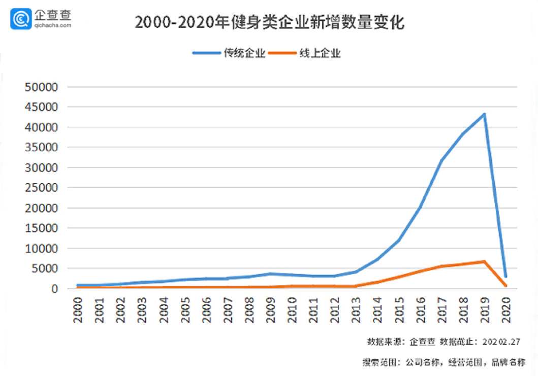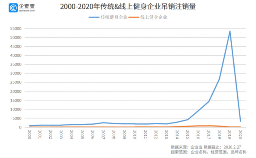 比起火熱的線上健身,線下健身在經歷了前幾年的寒冬后,又因疫情遭受了“滅頂之災”。據企查查顯示,傳統健身企業的注銷數量自2013年開始直線上升,2019年達到達到峰值,為53430家,2020年1月至2月疫情期間,傳統健身企業又相繼注銷了3295家,比2014年一整年的數量都多。