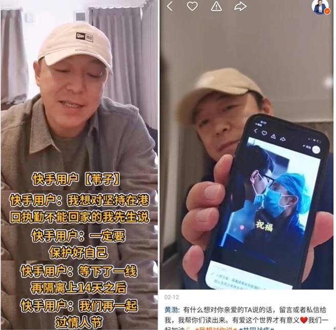 電影演員黃渤在快手有1600多萬粉絲,最近他在快手看到很多感人的短視頻,意識到“因為疫情,許多人的生活發(fā)生了變化。抗疫一線的英雄們,堅守在自己工作崗位的人,還有更多待在家里的人……也許很久都沒和父母、親人、朋友、戀人見面和交流了。”