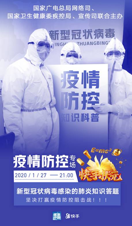 2020年1月27日,快手運營的直播答題活動“快手狀元”,聯(lián)合國家廣播電視總局網(wǎng)絡(luò)司、國家衛(wèi)生健康委疾控局和宣傳司首次推出“疫情防控”專場,該場直播答題參與人數(shù)達(dá)到928.7萬,集中向用戶普及了防護(hù)知識,傳遞權(quán)威信息。