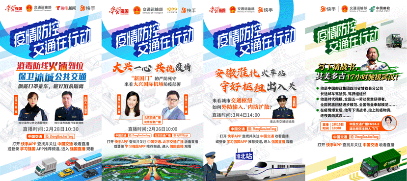 2月7日以來,交通運(yùn)輸部聯(lián)合快手,推出了“疫情防控,交通在行動(dòng)”系列直播,到今天已經(jīng)進(jìn)行了13場(chǎng),場(chǎng)均觀看人數(shù)超過500萬。直播內(nèi)容涉及了高速、鐵路、民航、郵政、海運(yùn)、公交、地鐵等各行各業(yè)。從海口的海港碼頭,到哈爾濱的冰天雪地,直播的足跡邁過北京、湖北、湖南、山西、河北、江蘇、浙江、安徽、黑龍江、內(nèi)蒙古、四川、海南共12個(gè)省及直轄市。