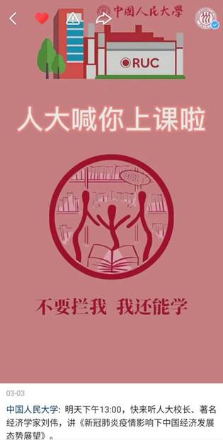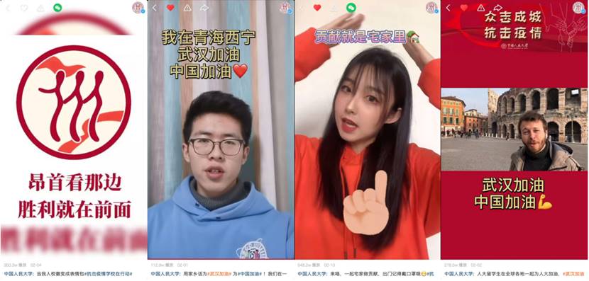 中國人民大學入駐快手以來,通過號召全球校友拍攝祝福視頻、將人大校會制作成抗“疫”表情包、記錄校園里堅守一線的校工、為醫護人員創作三行情書、參與高校洗手舞接力賽、為新聞學院副教授創作的抗“疫”歌曲《惟愿》制作MV等形式,展現出了人大學子和教職員工們的名校風采。短時間內創作了多款百萬+播放的視頻作品,目前已有3萬多名網友關注中國人民大學的官方快手賬號,聆聽人大的精品課程,與人大學子在線互動。