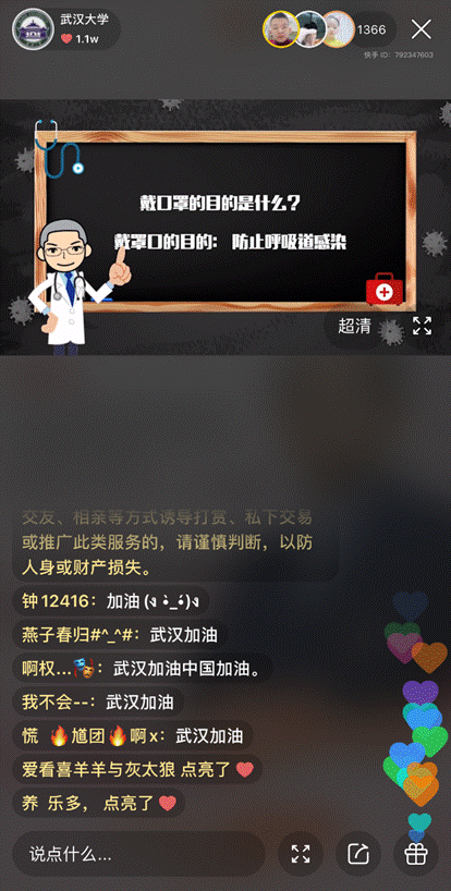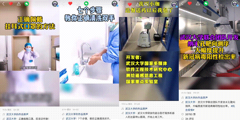 在常識科普方面,武漢大學在快手發布武漢大學醫院關于“正確佩戴掛耳式口罩的方法”、“七步教你正確清洗雙手”等視頻,與大家分享專業防護知識。此外,武漢大學研發的首臺醫療服務機器人到達雷神山醫院上崗工作、武漢大學聯合團隊開發納米孔靶向測序大幅度提升等科研成果,也都通過快手被越來越多人知道。
