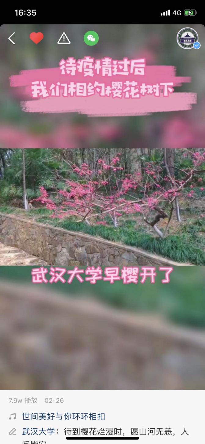 去武大賞櫻花是許多人的愿望之一,在近期的一條快手視頻中,武大校園內一片綠色,早櫻已經盛開。“春色如許,靜候君歸”,不少人都在視頻下方留言:“疫情過去我們武大櫻花樹下見。”這是約定,更是希望。