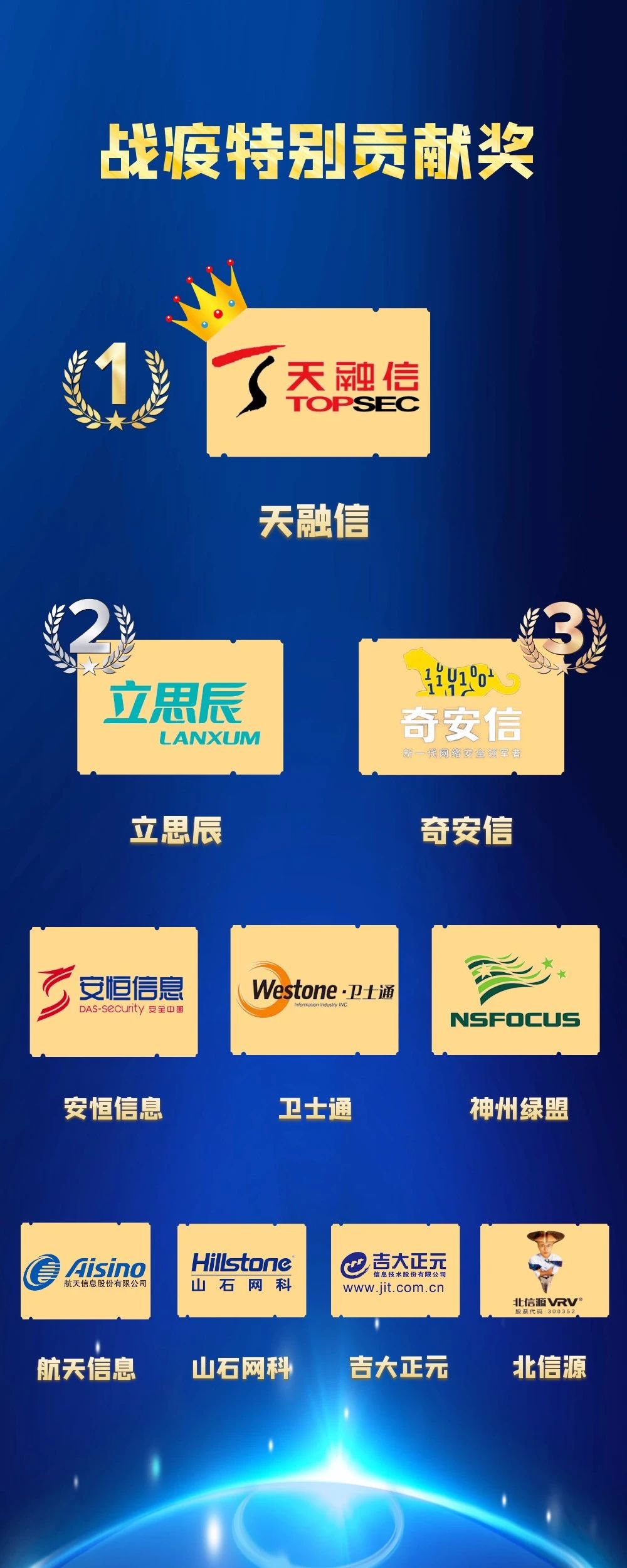 新冠肺炎疫情發生以來,眾多網安企業積極響應黨中央、國務院號召,反應迅速、主動作為、積極行動,不僅 主動捐款捐物,還充分發揮信息通信行業網絡、技術和隊伍等優勢,組織力量為黨政機關、醫療機構、公共應急、教育教學等疫情聯防聯控單位以及重點工業互聯網企業等用戶提供網絡安全技術支撐,主動溝通對接,及時為重點用戶相關網站和信息系統提供各種安全應急處置支撐。故此,“2019 年度(第四屆)中國網絡安全與信息產業金智獎”評選表彰活動為其會員單位特設“戰疫特別貢獻獎”。該獎評選的材料來自公開媒體,由評委會編輯整理。