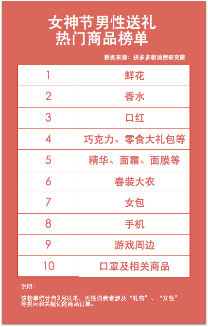 速途網(wǎng)3月8日消息(報道:李楠)今日,拼多多發(fā)布了《女神節(jié)男性送禮熱門商品榜單》。該榜單對3月以來,男性消費者涉及“禮物”“女性”等相關關鍵詞商品訂單進行統(tǒng)計,最終“鮮花”“香水”“口紅”再度上榜,成為男性送禮“老三樣”。