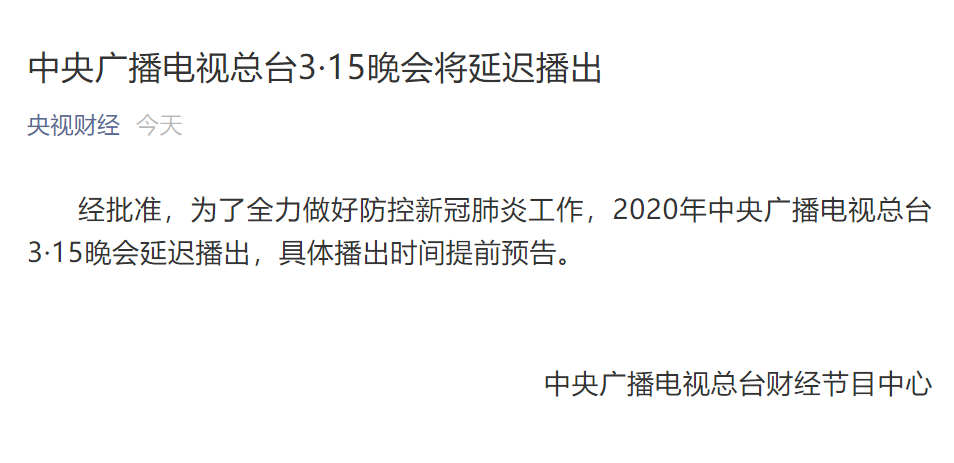 中央廣播電視總臺(tái)3·15晚會(huì)將延遲播出 仙雯 ? 2020年3月9日 09:37 ? 快訊, 資訊 速途網(wǎng)訊 今日,據(jù)央視財(cái)經(jīng)報(bào)道稱,為了全力做好防控新冠肺炎工作,2020年中央廣播電視總臺(tái)3·15晚會(huì)延遲播出,具體播出時(shí)間提前預(yù)告。 贊 (0) 仙雯 0 生成海報(bào) 華為預(yù)計(jì)今年手機(jī)出貨量將下降約20% 上一篇 2020年3月9日 09:35 飛豬推出首批5億元無抵押低息貸款,再為商家資金紓困 下一篇 2020年3月9日 09:46