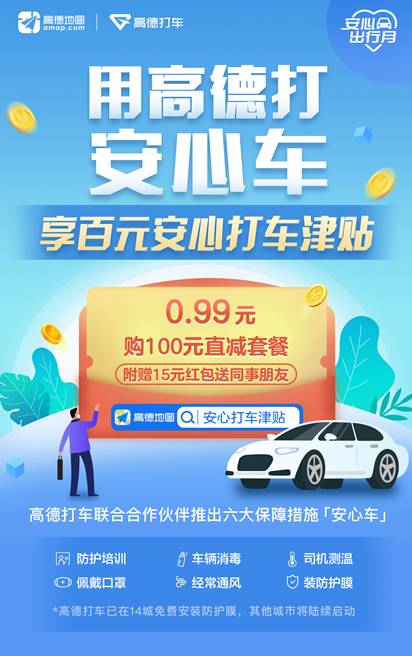 在打車出行方面,高德地圖近日聯合眾多網約車合作伙伴共推 “安心車”服務,通過防護培訓、車輛消毒、司機測溫、佩戴口罩、經常通風、免費安裝防護膜等六大措施,全力保障司乘安全。此外,高德打車還推出多項優惠,用戶在高德地圖App中搜索“安心打車津貼”,只需0.99元即可購買價值百元的優惠套餐;從“全國百大熱門復工寫字樓”出發,還可最高立減7元,為乘客提供既安心又優惠的打車出行服務。