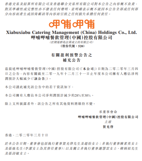 呷哺呷哺:預計2019年公司凈利潤減少28%-38% 仙雯 ? 2020年3月11日 14:27 ? 快訊, 新餐飲 速途網訊 昨日,呷哺呷哺發布盈利預警的補充公告,預計2019年公司凈利潤減少28%-38%。此前,呷哺呷哺曾發布盈利預警公告,預期2019年公司凈利潤較2018年有顯著減少,原因是與租賃相關的會計準則發生了變化。 呷哺呷哺 贊 (0) 仙雯 0 生成海報 微軟首次任命首席科學官,領導先進技術研發業務 上一篇 2020年3月11日 14:23 全國1.2億學生在釘釘上課,無招:為社會健康發展而打造 下一篇 2020年3月11日 15:16