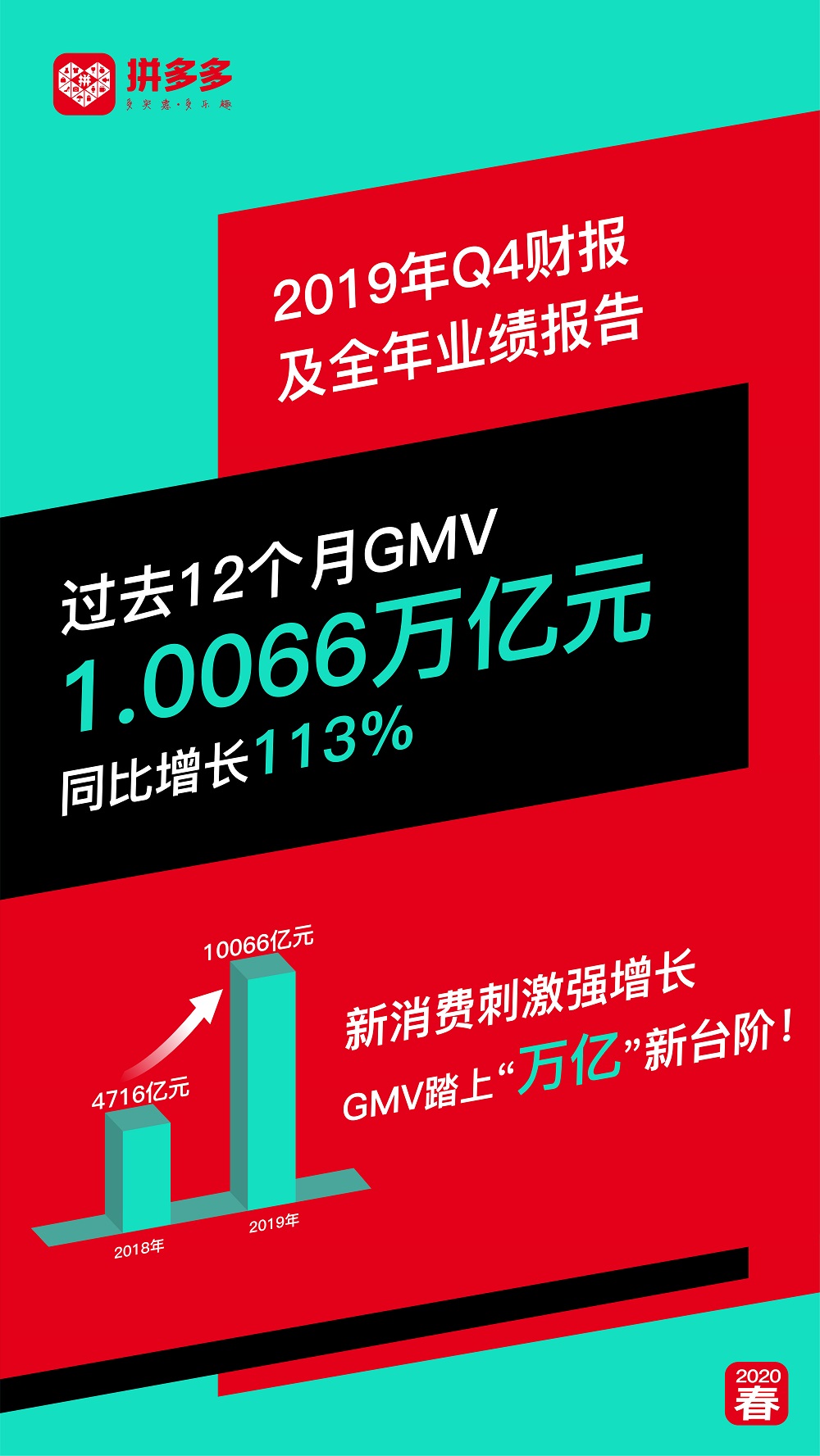 速途網(wǎng)訊 今日,新電商平臺(tái)拼多多(NASDAQ:PDD)發(fā)布的2019年第四季度財(cái)報(bào)顯示:2019年全年,平臺(tái)GMV為人民幣10066億元,較上一年的4716億元同比增長(zhǎng)113%。