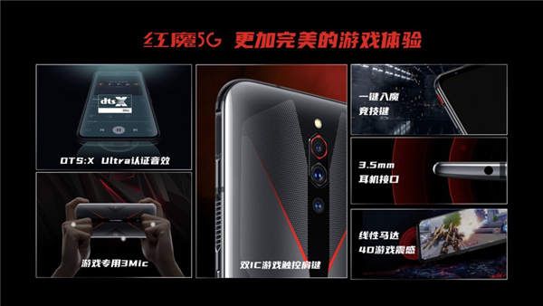 在對游戲氛圍影響極大的音頻方面,努比亞多年來堅持采用立體聲揚聲器并保留3.5mm耳機接口。并在紅魔5G上與業界頂級音頻解決方案商DTS進行合作,實現了DTS-HD多聲道音頻硬件解碼器和專業DTS:X Ultra認證音效在游戲手機上的落地。除此之外,位置經過精心設計的游戲專用3Mic,則可以保證無論玩家用那種姿勢握持,都能帶來清晰的降噪語音溝通體驗。
