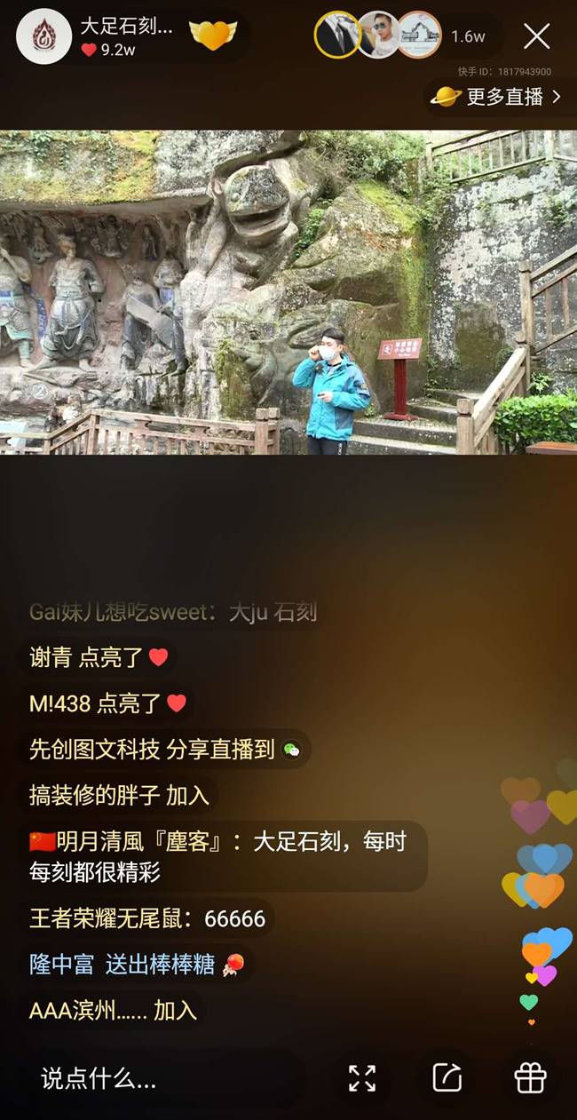其實,疫情并未阻斷人們與大足石刻的聯(lián)系。3月11日至12日,越來越多人發(fā)現(xiàn),大足石刻景區(qū)(ID:1817943900)正在快手直播。在景區(qū)講解員、主持人和大足石刻研究院副院長的引導下,重慶市民得以通過快手直播重回每年都要去拜一拜的石窟、寺廟;全國各地的網(wǎng)友也在這個無法旅游的特殊時期,有機會瞻仰大足石刻這座聞名世界的歷史遺跡。