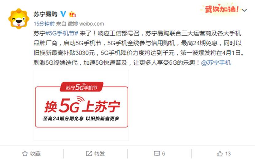 響應工信部號召,蘇寧易購于今日宣布,將聯合三大運營商和各大手機品牌廠商,啟動5G手機節,活動期間5G手機全線參與分期免息,最高24期免息,同時以舊換新最高補貼力度達到3030元,5G手機降價力度將達到千元,第一波爆發節點在4月1日,刺激5G終端消費,加速5G快速普及。