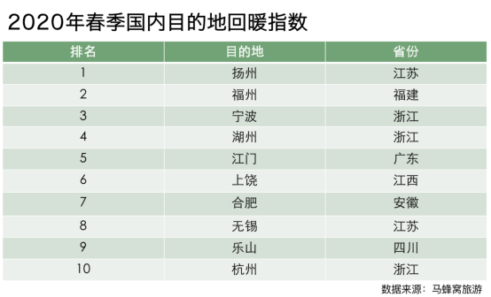 報(bào)告指出,3月18日開始,全國(guó)眾多旅游目的地和景區(qū)熱度都出現(xiàn)明顯回升,全國(guó)城市熱門周邊游景區(qū)旅游熱度平均漲幅達(dá)到67%,很多游客趁周末走出家門,自駕前往城市周邊。其中,東南部省市居民的旅游消費(fèi)水平較高,現(xiàn)階段人們的出游都還集中在客源地周邊,因此旅游回暖趨勢(shì)也最為顯著。國(guó)內(nèi)熱門目的地中,揚(yáng)州、福州、寧波、湖州、江門、上饒、合肥、無(wú)錫、樂(lè)山和杭州的旅游回暖指數(shù)最高。