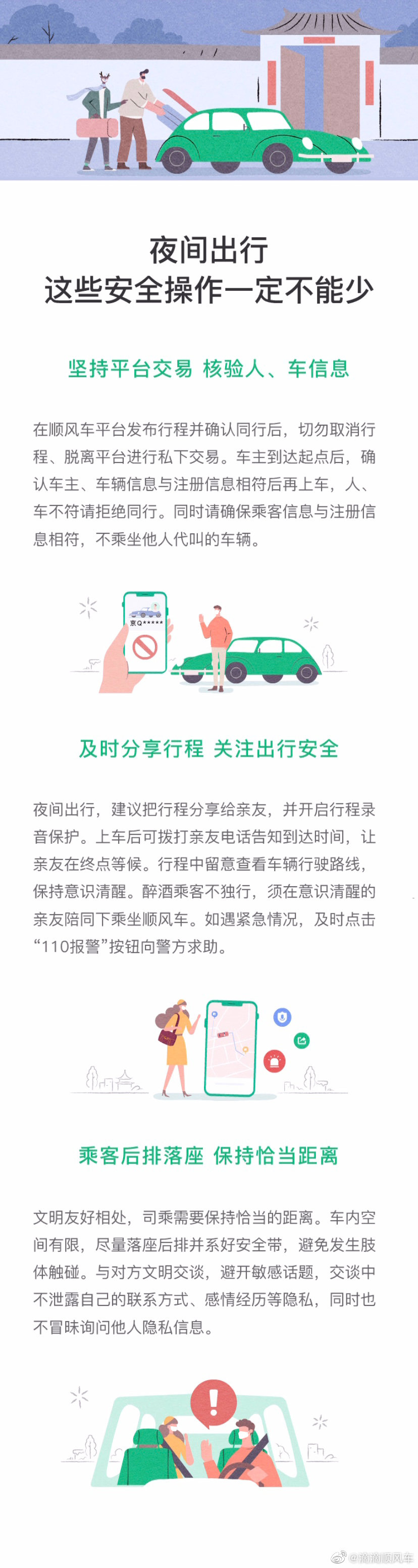 此外,滴滴還為乘客提供了一份夜間出行安全提示。在這份提示中,滴滴提醒乘客堅持平臺交易,核驗人、車信息,及時分享行程,關注出行安全,后排落座保持恰當距離。