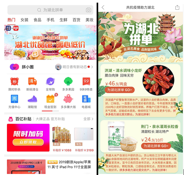 同日,拼多多聯合央視發起“為湖北拼單”大型活動,通過“政府指導—主流媒體平臺引導—核心市場銜接”的創新機制,探索后抗疫時期推動湖北涉農經濟加速發展的新業態。