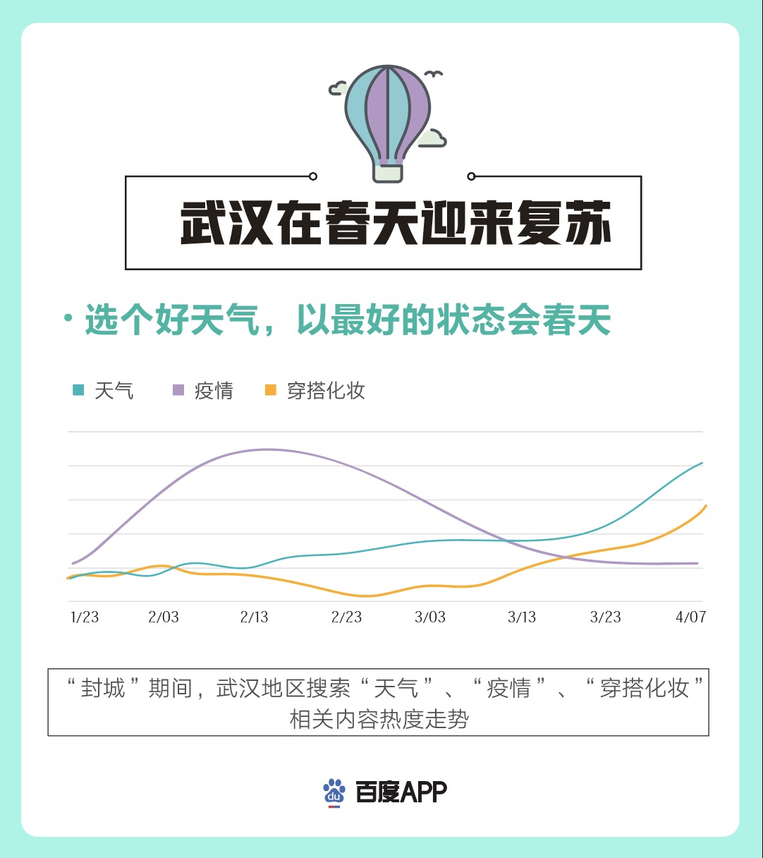 近日發布的《武漢重啟,疫散花開 百度搜索大數據報告》(以下簡稱“報告”)顯示,武漢的正常生活正在回歸,“天氣”、“穿搭化妝”等搜索熱度在3月下旬均超過“疫情”相關內容。同時,交通復蘇、復工復產也有序開展,“復工證明”近30天的搜索熱度環比增長320%。值得注意的是,疫情對武漢經濟和民眾心理的影響并未消失,“封城”期間,武漢地區搜索“信用卡逾期”相關內容的熱度達十年來最高。此外,在疫情明顯得到控制后,“心理健康”相關內容近30天的搜索熱度環比上漲20%。