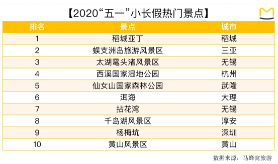 受疫情影響,很多原本喜歡跨省甚至出境旅行的都市群體,也開始在城市里尋找出游踏青的新景點(diǎn),深圳的楊梅坑首次進(jìn)入熱門景點(diǎn)前十。此外,太湖黿頭渚風(fēng)景區(qū)、西溪國家濕地公園、仙女山國家森林公園、洱海、拈花灣、千島湖風(fēng)景區(qū)、黃山風(fēng)景區(qū)也進(jìn)入熱門景點(diǎn)榜單。