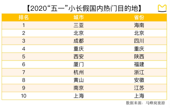 目的地方面,馬蜂窩大數(shù)據(jù)顯示,五一小長假熱度最高的國內(nèi)旅游目的地分別為:三亞、北京、成都、重慶、西安、廈門、杭州、黃山、南京、上海。馮饒分析,五一期間游客的出游半徑仍會以居住的市區(qū)和周邊為主,這也將是未來一段時(shí)間的主流出游趨勢。