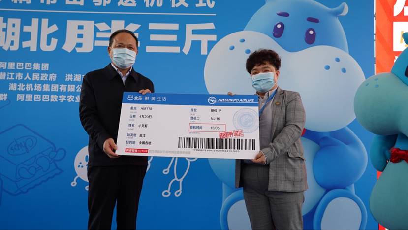 速途網(wǎng)4月20日消息(報(bào)道:李楠)今天下午,武漢天河機(jī)場,湖北省副省長萬勇給眾多生鮮農(nóng)產(chǎn)品包裝箱“派發(fā)了登機(jī)牌”。小龍蝦、藕帶隨盒馬包機(jī)出省。