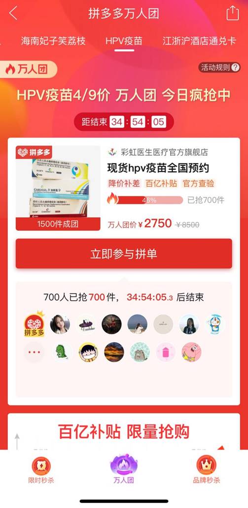 速途網(wǎng)4月29日消息(報道:李楠)今日,備受全網(wǎng)歡迎的拼多多現(xiàn)貨HPV疫苗,再度以“秒殺萬人團”的形式返場。