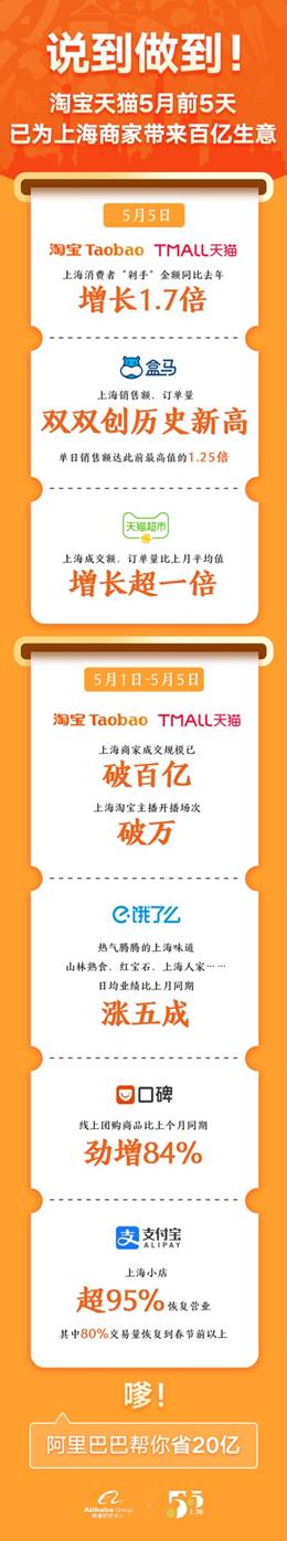 4月23日,阿里巴巴宣布全力支持上海“五五購物節”,在5月、6月繼續推出大力度促消費實招,發揮線上線下融合的新零售獨特優勢,打響新消費的春雷。事實證明,阿里巴巴言出必行。