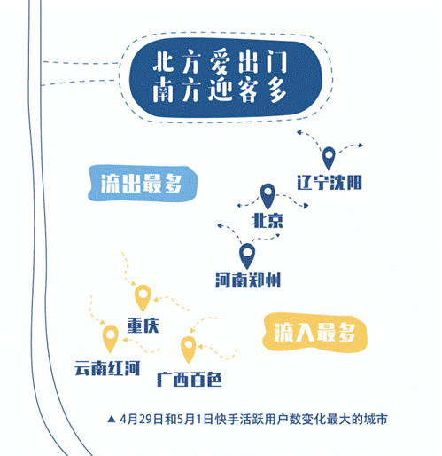 人口流動方面,快手用戶的出行呈現出南北差異。北京突發公共衛生事件應急響應級別自4月30日零時起調整為二級,相關防控策略得到調整,5月1日當天,京津冀駕車流動高,北京與廊坊、保定、天津的往來活躍。報告顯示,北京、河南鄭州、遼寧沈陽都是出行較多的城市;而流入最多的城市則集中分布在南方,排名前三的城市有重慶、廣西百色和云南紅河州,小眾目的地獲得關注。