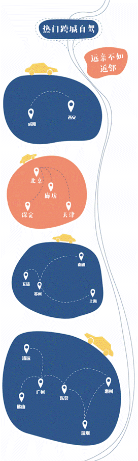跨城駕車出行的熱門區域主要集中在珠三角,深圳、東莞、廣州、佛山、惠州熱度較高,粵港澳大灣區的出行吸引力突顯。北方城市中,咸陽與西安、京津冀之間的跨城駕車流動高,長三角的蘇州、無錫、上海、南通之間流通也比較活躍。