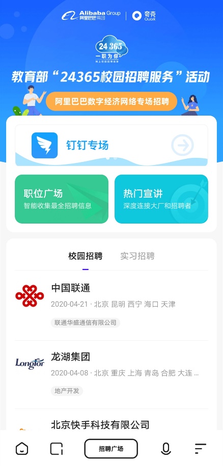 5月11日起,大學生在夸克搜索“找工作”關鍵詞,或者在首頁“捷徑”入口點擊“找工作”,可以進入招聘會專區(qū)。通過釘釘APP、支付寶APP搜索“校招”小程序也可以直接進入線上招聘會場。