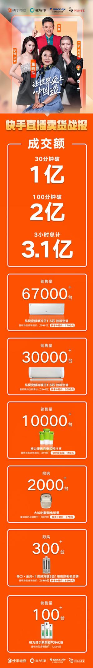 董明珠此前透露,董明珠線上店 2019 年的格力電器銷售額為3.5億元。也就是說,快手3個小時的直播快趕上了董明珠網店去年一整年的業績。