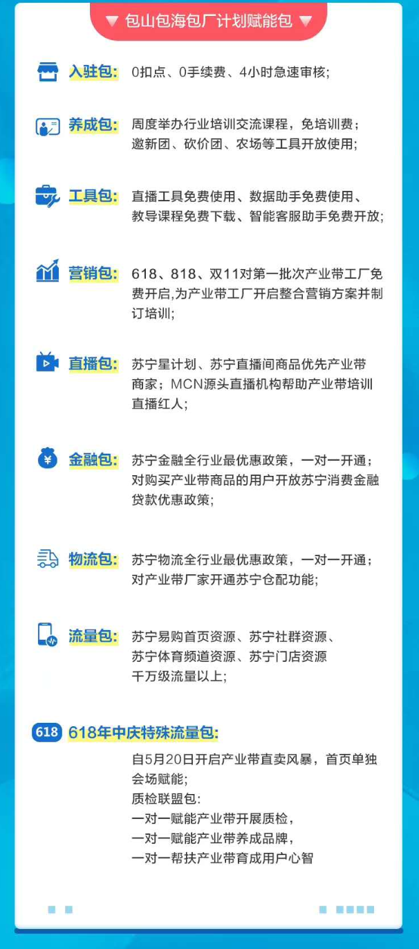 為了扶助產業帶商戶快速成長,蘇寧拼購發布了“包山包海包廠”賦能包,從物流、金融、營銷、直播、工具等多個角度扶助產業帶商戶。