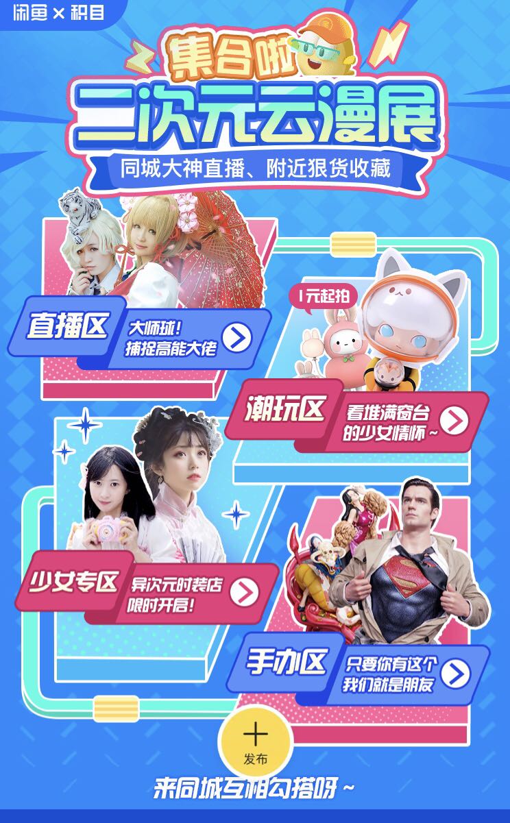 在泛二次元圈層,“春日祭”一直是重要時點。據不完全統計,去年5月全國共舉行超過90場線下漫展。今年因疫情影響,國內暫無漫展落地,本次閑魚聯動積目的“云漫展”,順應云趨勢,也滿足了許多泛二次元用戶的期待。