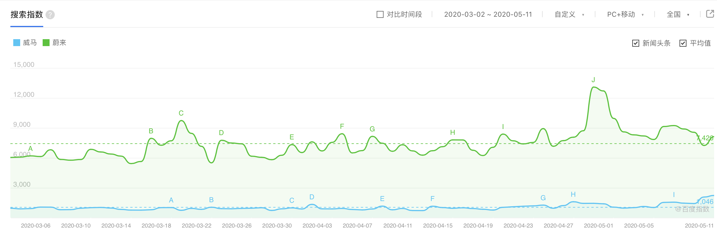 雖然蔚來在營銷上的高歌猛進,極大增加了市場營銷的開支,但是在市場的知名度上,二者差距十分明顯。對比近兩個月的百度指數,蔚來高達7426、而威馬僅為1046,而且,這還是在威馬近日剛剛發布新品后的數據。