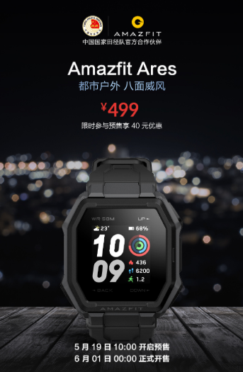速途網(wǎng)5?月?19?日訊(報(bào)道:喬志斌)今日,華米科技正式發(fā)布智能手表Amazfit Ares,其售價(jià)為?499元,現(xiàn)已在天貓?Amazfit?旗艦店、京東?Amazfit?旗艦店、小米商城、小米有品、華米科技微商城開啟預(yù)售,預(yù)售期間可享?40?元首發(fā)優(yōu)惠,?6月1日正式開賣。