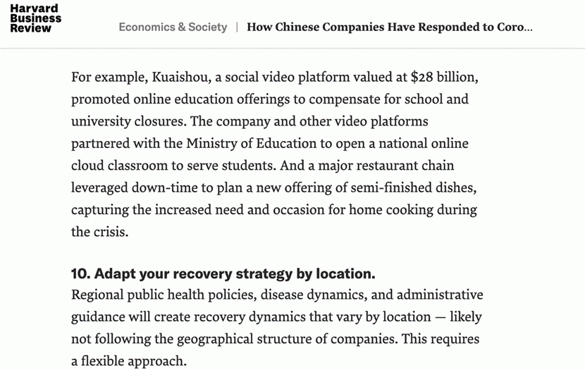 《哈佛商業評論》認為,盡管疫情在一定程度上影響了所有領域,但許多特定領域的需求卻在增加,以快手疫情期間上線的“停課不停學”免費學習專區為例,說明中國公司非常善于在危機中發現需求、解決需求。