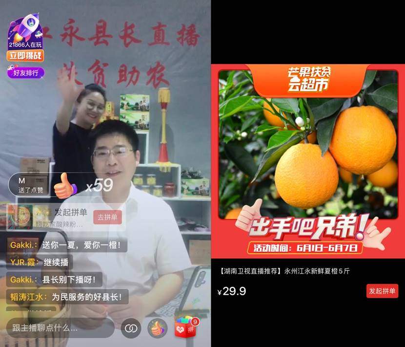6月2日,湖南省永州市江永縣的夏橙成為拼多多平臺消費者關注的主角。在拼多多湖南衛視“芒果扶貧云超市”直播間,江永縣人民政府縣長唐德榮變身“鄰家大叔”,邀請消費者拼上幾單“江永夏橙”。