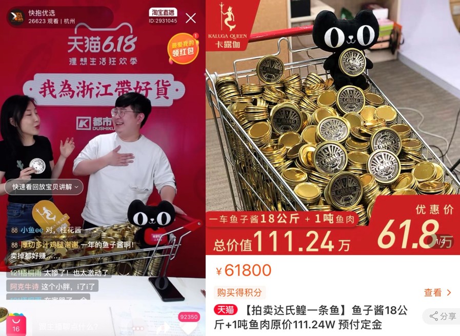 昨晚,淘寶直播創下史上最大份魚子醬的成交記錄!在天貓618“理想列車”尋味浙江的直播間,裝滿整整一個購物車的18公斤達氏鰉魚子醬以61.8萬拍出,成為淘寶直播間賣出的“最貴農產品”。