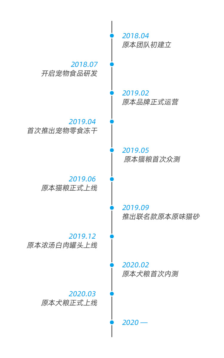 2019年2月,「原本」品牌應運而生,致力于用可溯源的原料,科學嚴謹的品控標準,以及耐心專業的服務,讓毛孩子健康成長,幫助養寵家長省時、省錢、省心。