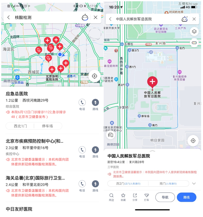 速途網6月14日消息(報道:李楠)今日,高德地圖快速上線了北京市衛生健康委公布的全市98家具備核酸檢測能力的機構。市民在高德地圖上搜索“核酸檢測”便可一鍵查詢,就近前往。